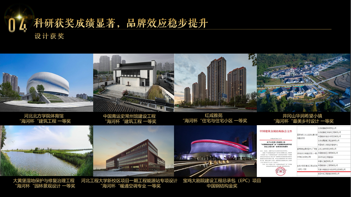 公司作為第一完成單位獲得中國風景園林學會科學技術獎,天津市風景園林學會科技進步獎二等獎。榮獲教育部優秀勘察設計、“海河杯”天津市優秀勘察設計獎多項。斬獲第37屆韓國釜山國際建筑設計競賽大賽金獎、2項鼓勵獎?!皩氹u大劇院建設工程總承包(EPC)項目”榮獲第十四屆“中國鋼結構金獎”。