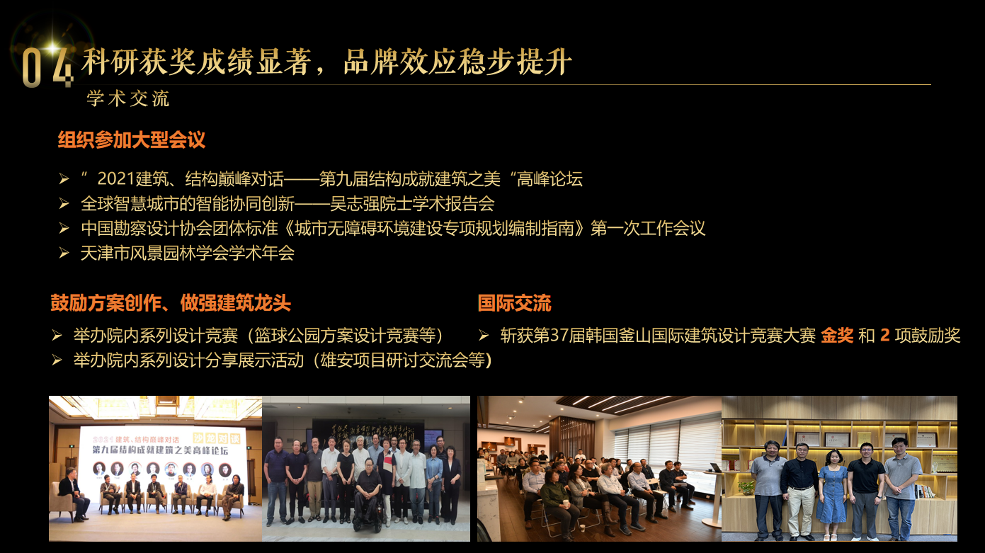 投入科研經費支持專業中心建設、專項業務拓展與建筑創作創新。承辦組織多場大型學術會議,搭建跨界交流平臺,吸收國內外頂級前沿的理念與經驗,為行業多元發展碰撞出新思路。在中國建筑科學大會暨綠色智慧建筑博覽會(GIB)上全方位展現公司近年來極具代表性的優秀設計作品。