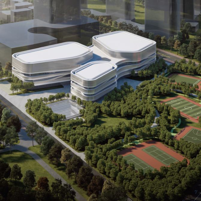 科技文體中心以體量分散,曲線流動的建筑形態與濱江商務區整體的建筑風格相協調,同時為商務區注入新的活力。建筑立面以水平向展開,圓潤的輪廓以及交錯流動、充滿韻律感的曲線賦予文體中心活潑、動感的建筑形象。水平向的曲線為文體中心帶來了不斷變化的空間形式,使建筑在不同的視角呈現出不同的面貌。立面材質選用穿孔鋁板幕墻與玻璃幕墻的組合,營造出文體中心動感且充滿未來感的氣質。