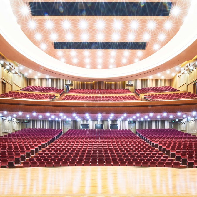 建筑剖面設計,因場地三面高差變化較大,又結合文化活動建筑自身縱向設計先天的復雜性,設計中如何令功能完美的嵌入場地,成了該項目的難點與重點。設計中不斷細化文化演藝中心的觀演及排練流線,巧妙的利用場地高差實現行人、視線分流,所見效果斐然,既形成了悅動的空間,又使得流線如行云般順暢。