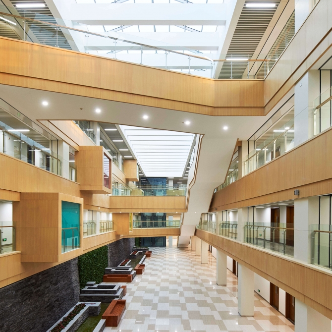 運用空間上起承轉合、連續(xù)拓撲變化的折板,形成富有層次的天際線,一氣呵成。建筑立面材料選用硬朗線條突出的石材與鋁板,現代氣息濃郁,再經錯動點綴的橫向與縱向遮陽板使立面更為豐富。