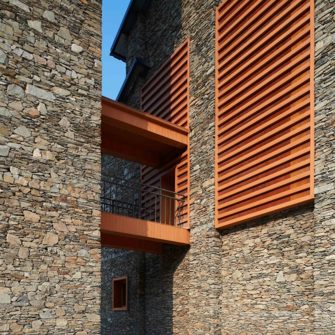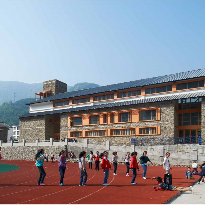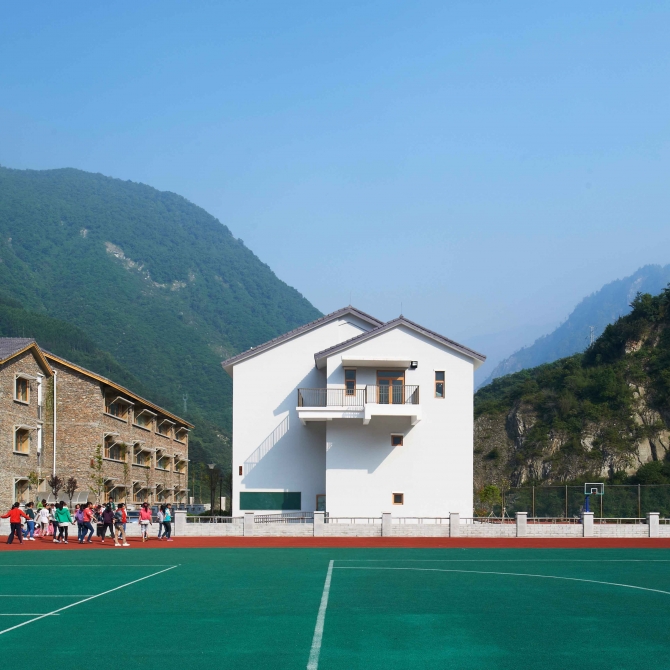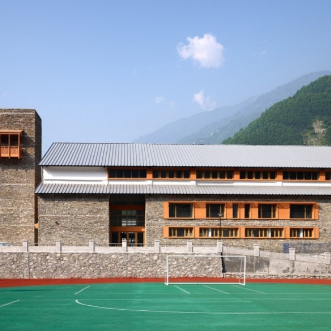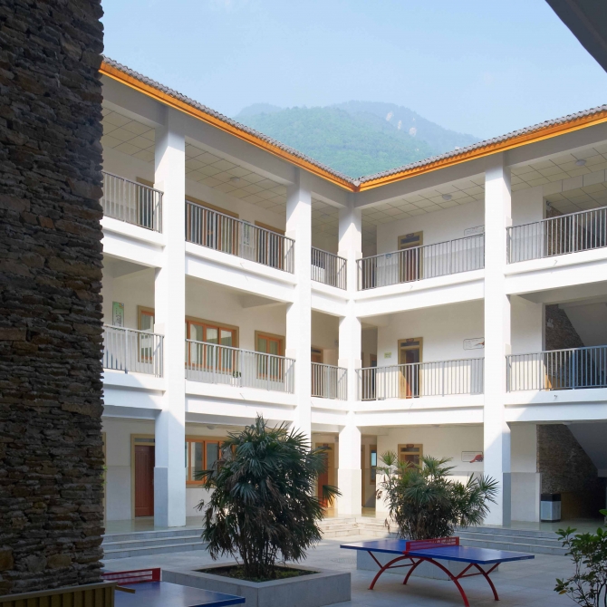 建設場地地形條件復雜,高差較大,設計充分利用現有地形,既考慮了土方平衡的經濟性,又形成了獨具特色的校園風貌。校園內各功能部分別設置于獨立的建筑單體內,避免使用上相互干擾,同時建筑單體體量較小,順應地勢沿河岸錯落布局,符合當地傳統民居的建筑尺度,避免對周邊環境造成突兀的壓迫感,既體現了對地域傳統生活方式的尊重,又與自然環境相協調。