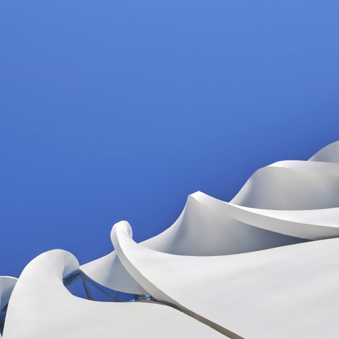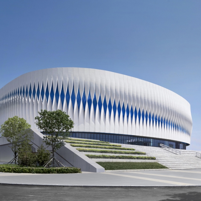 體育館方案選擇頗具傳統特色的“燈彩”建筑造型,采用“藍白”作為建筑主色調,力求與校園及城市的人文特色相結合,并能夠彰顯出冬奧會項目的特質。從著名的張家口市蔚縣剪紙藝術中汲取營養,外圍很像剪紙,內部是彩色的,遠看酷似燈籠。就像一個被旋轉了180°的紙片,能夠增加律動感。