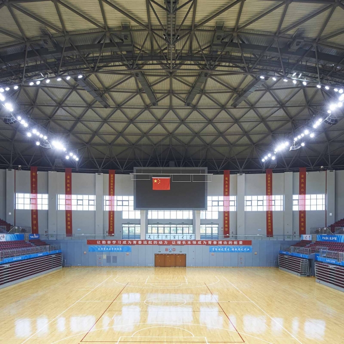 建筑造型以橢圓形的形態為出發點,和原有風雨操場的形態保持一致,也呼應了建筑南側的國際交流中心的總體形象。建筑三面平臺的造型,既滿足了觀眾的疏散要求,又是新老建筑連接的手段。建筑外立面采用干掛石材裝飾幕墻,使體育館在完成形象表達的同時又控制了整體造價,材料的自潔功能又使建筑歷久彌新。建筑橢圓形的金屬屋頂向四周懸挑,設金屬百葉吊頂,從而獲得建筑、結構、設備各專業的和諧統一,既展示了建筑的結構之美,也增強了建筑的動感和活力。
