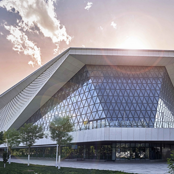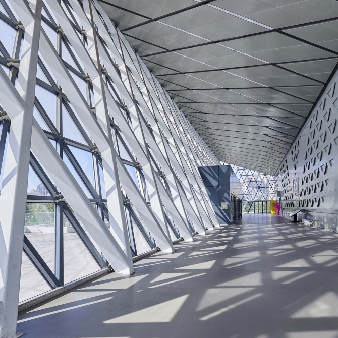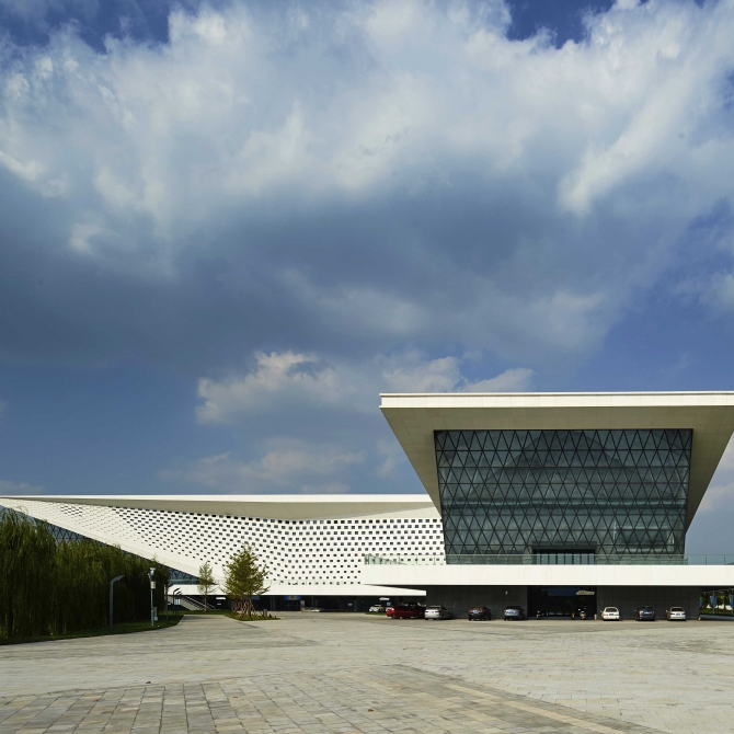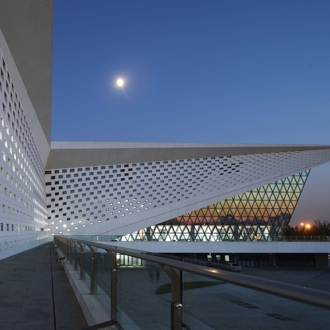 建筑師采用相對純凈包容的整體設(shè)計(jì)手法,將復(fù)雜的結(jié)構(gòu)體系包含其中,利用新型建材的可塑性強(qiáng)的特點(diǎn),進(jìn)行折疊、拉伸,以中國傳統(tǒng)折紙的手法使其顯得輕巧活潑,與復(fù)雜的結(jié)構(gòu)體系形成對比。建筑有著及其韻律感的外窗,不但保證建筑表面動(dòng)感的效果,也保證純凈建筑體量效果不會(huì)過于呆板。GFRC外墻在建筑實(shí)體的內(nèi)核之外形成半透明空間,其間布置觀眾通道所必須的交通設(shè)施,通往室外大平臺和樓梯穿插其間,給行走期間的人們一種難以忘懷的體驗(yàn)。