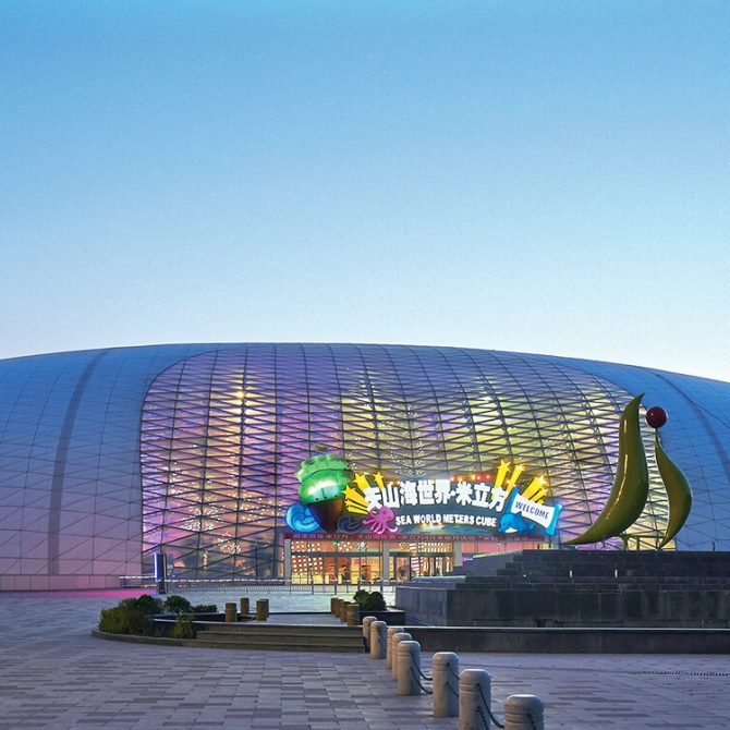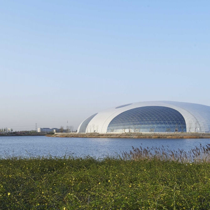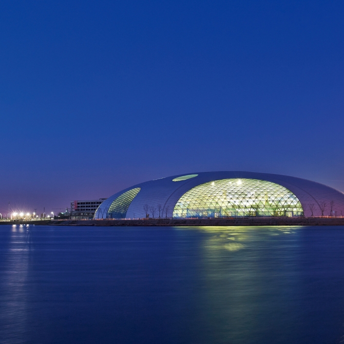 外觀設(shè)計(jì)理念源于馳名中外的“小站稻”,體現(xiàn)晶瑩剔透,純靜亮麗的意境;設(shè)計(jì)采用橢圓形半球體的造型,覆蓋開放式的鋁合金裝飾板屋蓋和浮點(diǎn)式透光玻璃相結(jié)合的外表皮,潤(rùn)澤圓華;具有強(qiáng)烈的地標(biāo)性建筑特色。