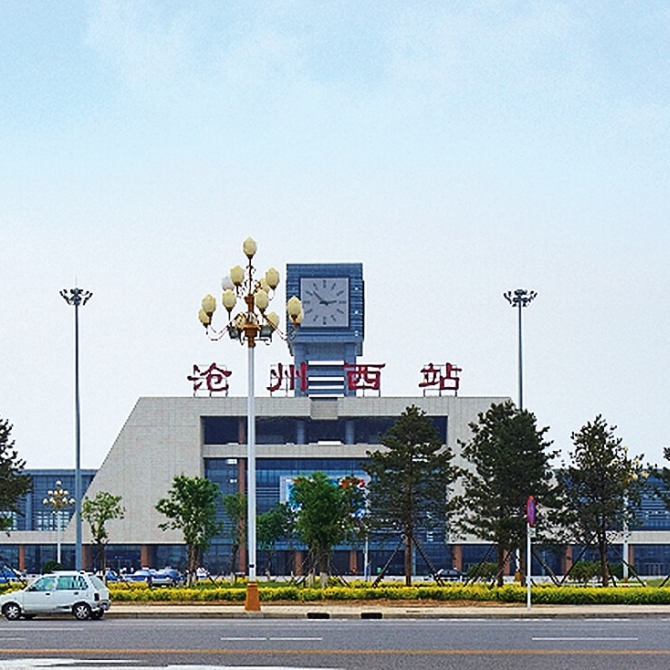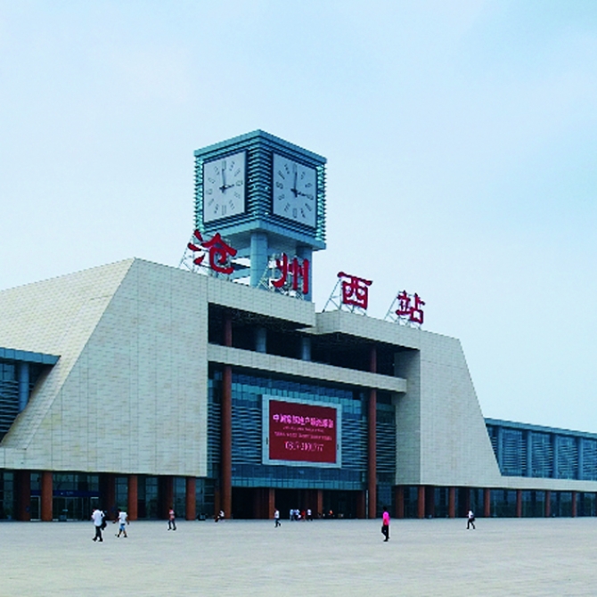 滄州市京滬高鐵站位于滄州高鐵火車站東北側,與高鐵站貼鄰建設,西北側為高鐵軌道,東南側為站前廣場,東北側為停車場。