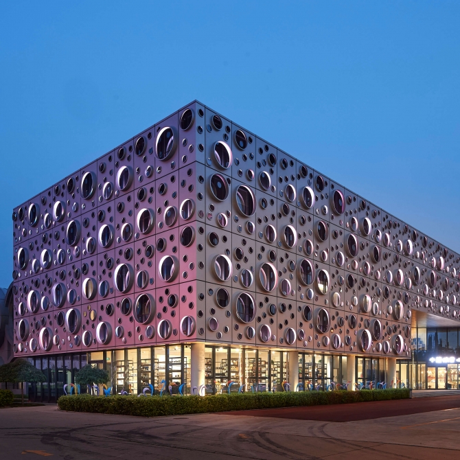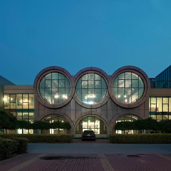 “新”—— 以生產(chǎn)企業(yè)“玻璃燈工”的加工原料玻璃管材為造型設(shè)計(jì)的出發(fā)點(diǎn),提取圓形母體作為建筑表皮和建筑造型的元素,使建筑具有標(biāo)志性,成為當(dāng)?shù)匦碌貥?biāo),起到展示公司文化,改善城市新區(qū)景觀的作用。
