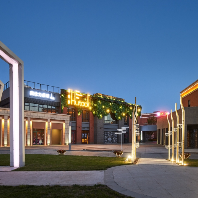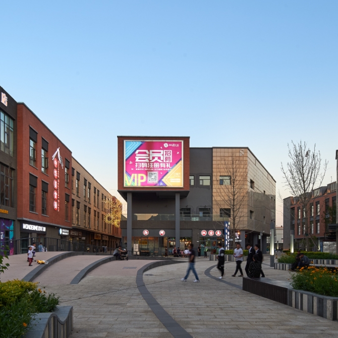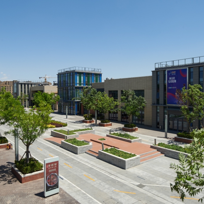 區域內的弧形室外商業街是項目的核心地帶,蜿蜒曲折從而創造出一條活力動感的商業步道,并在沿途適當的尺寸上穿插有一系列的院落和廣場,整體上將面積巨大的項目中各個商業景觀元素緊密聯系在一起。