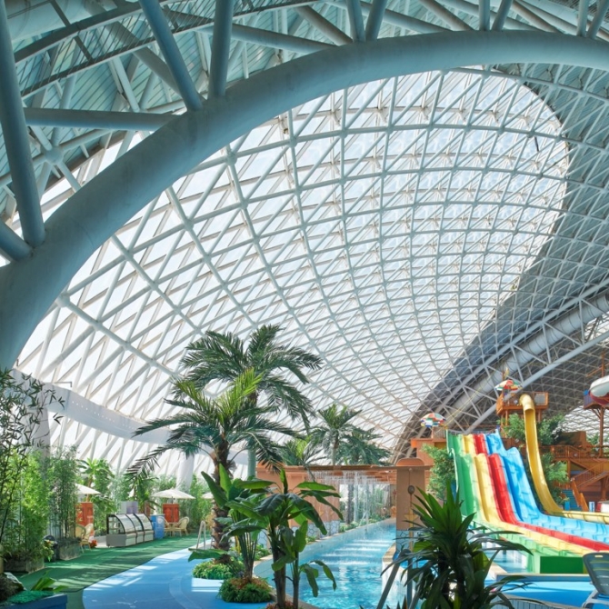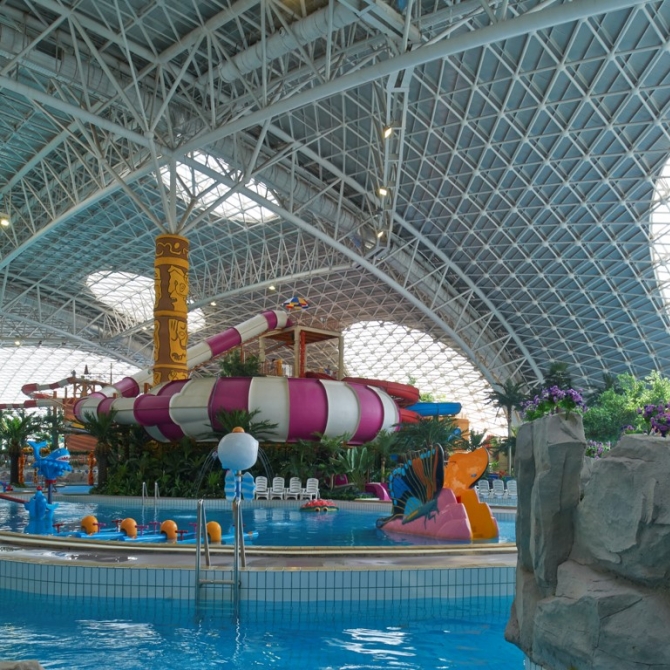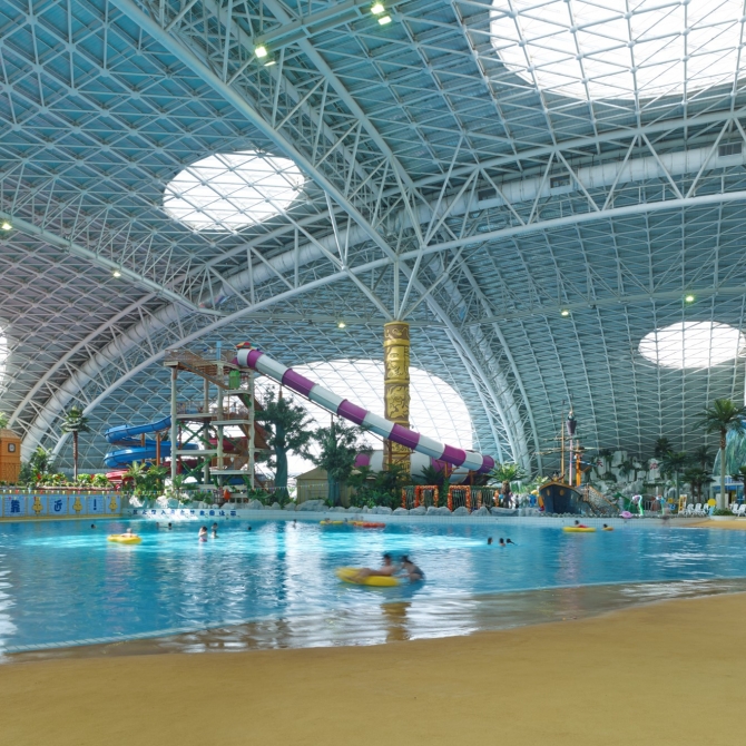 天津米立方工程位于天津市津南區小站鎮,整個建筑外形酷似國家大劇院,如同嵌入水中的一粒稻米,故得名“米立方”,是天津市最大的室內水上健身游樂中心,已成為國家5A級標準旅游景點。