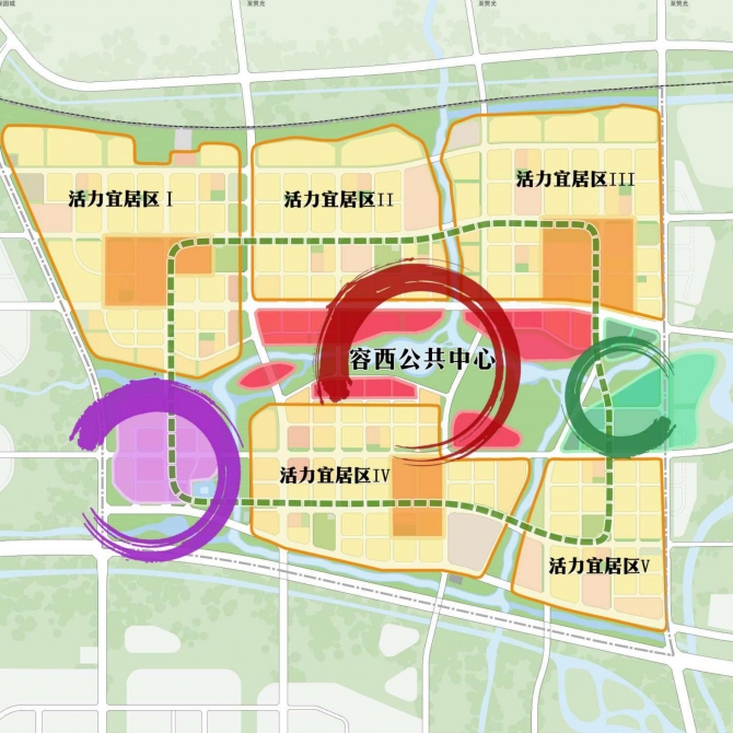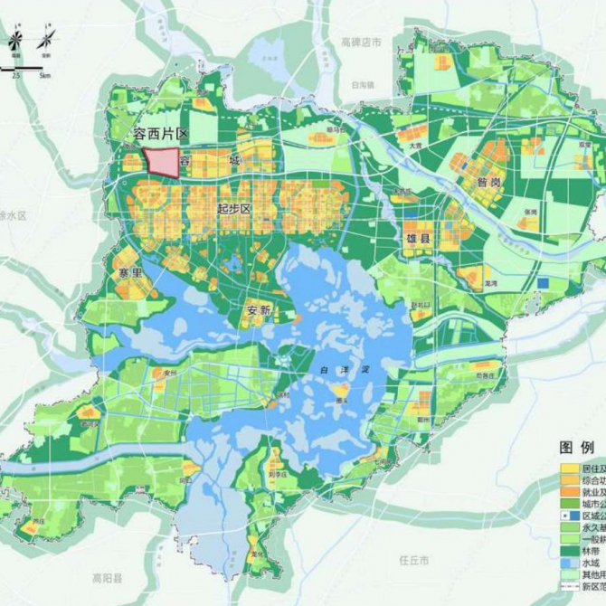 容西片區緊鄰起步區,與容城縣城、容東片區、起步區組團協同發展,主要城市交通線路、 生態廊道互聯互通,服務搬遷安居,具有保障起步區及周邊地區建設的重要功能。