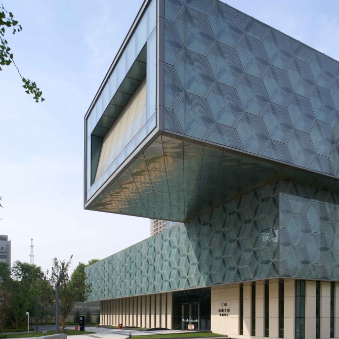 中糧天津六緯路項目體驗中心用地為“L”形,建筑形體根據地形條件設計為依地形盤旋生長的形式,形成內院和共享中庭,提供模型展示和顧客休息場所,退讓的距離也減少了對周圍既有建筑的影響,并形成了環狀的消防車道。主入口設在西側面向六緯路和地鐵站,入口大氣明顯,起到引導顧客流線的作用。 建筑立面采用玻璃幕墻形式,局部外墻采用干掛石材,以體現質感和力度感。玻璃幕墻采用雙層幕墻與單層幕墻相結合的形式,依據建筑體量的盤旋生長的形式采用雙層正六邊形幕墻加以突出,體現建筑的流動性。雙層玻璃幕墻形式以中糧集團標志為設計原型,以正六邊形彩釉玻璃加以圖案修飾予以體現,充分體現建筑的個性化、標識性,展示產品形象,體現公司實力。