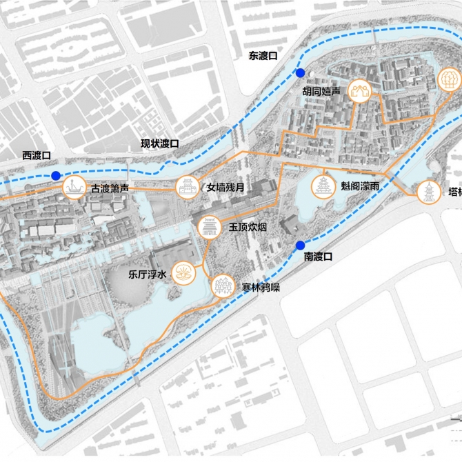 楊柳青大運河國家文化公園元寶島凈用地約50. 5公頃,城市主干道柳口路穿元寶島島心而過,將元寶島分為東、西兩島。東島規劃用地約20公頃,包含漕運文化街、楊柳青畫社、工藝美術非遺傳承基地、非遺文創市集、年畫文化體驗坊、非遺民俗坊、非遺文化街、年文化主題驛站等建筑集群;西島規劃用地約30.5公頃,包含御河文創區、漕運主題文化水街、公共曲藝文化活動坊、曲藝戲曲博物館、曲藝文化主題驛站、西青會客廳、四知書屋-青少年科技活動中心等建筑集群。東島和西島的四處主要建筑由地下室相連通。除建筑外,該項目中新建六座橋梁,并建設建筑周邊景觀。